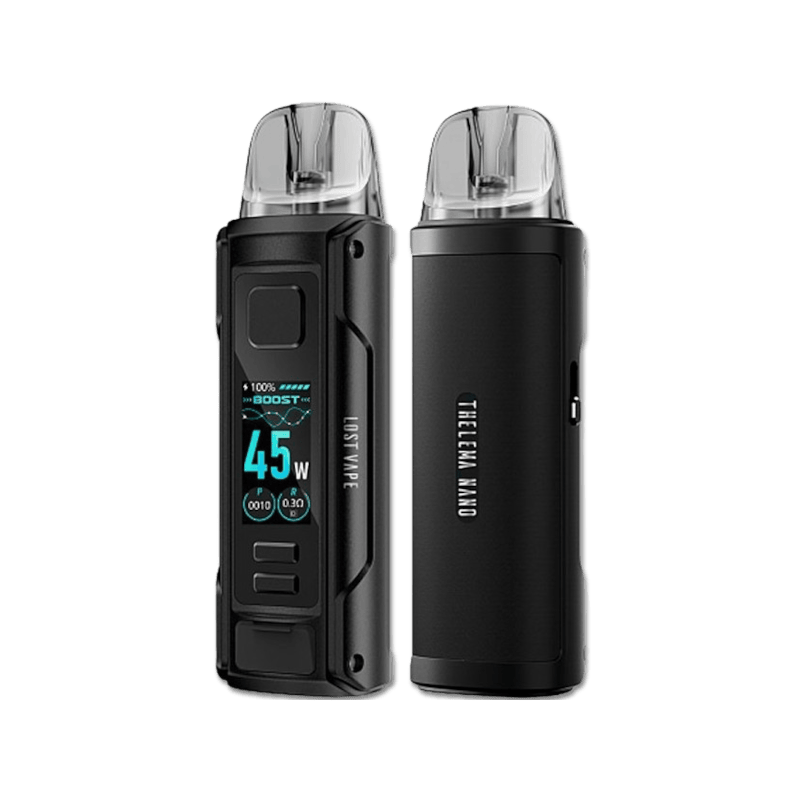 Lost Vape Thelema Nano Pod Kit 1500mAh 45W Midnight Black – В тази нова версия от серията Thelema на Lost Vape думата Nano се римува с максимална производителност. Работи с вградена 1500mAh батерия, която се зарежда бързо на 2A чрез USB-C. Разполага с нов интелигентен чипсет с 2 режима: Boost и Eco.