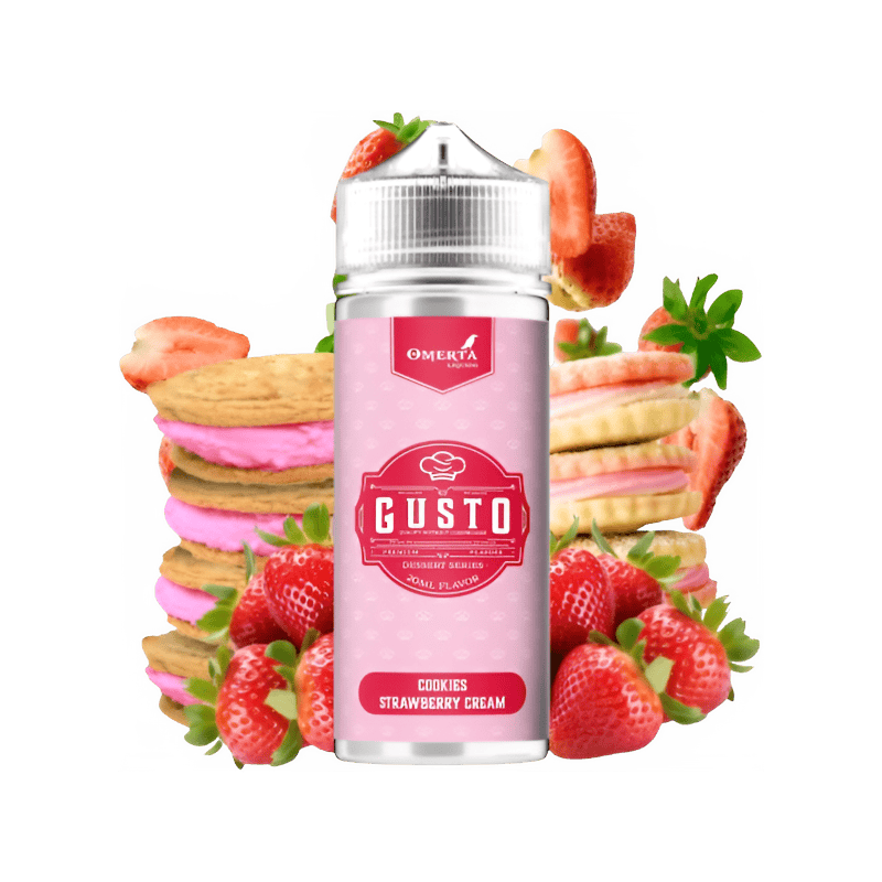 Gusto by Omerta Cookies Strawberry Cream 20ml for 120ml – Хрупкави бисквити, пълни с наситен, кадифен крем, направен от пресни, сочни ягоди за едно наистина възхитително вкусово изживяване.